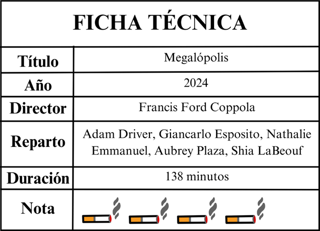Desde luego la indiferencia es la última emoción que se experimenta en una proyección de Megalópolis: gente levantándose en mitad de la película, mientras otros alucinábamos por la tan agradecida frustración de nuestras expectativas; una frustración que, tanto para la mayoría de la crítica profesional como la no profesional, constituye una herejía. Para muchos el último trabajo del director de El Padrino es una película que certifica la senilidad de su creador (sobre todo por parte del público), con sólo unos pocos atreviéndose a reivindicarla como el gran atrevimiento artístico que es. Inconexa, anárquica, disparate colosal, pomposa, delirante… son algunas de las lindezas (las más educadas) que le dedican. Por supuesto, en ellas hay verdad, pero también hay ojos cerrados.