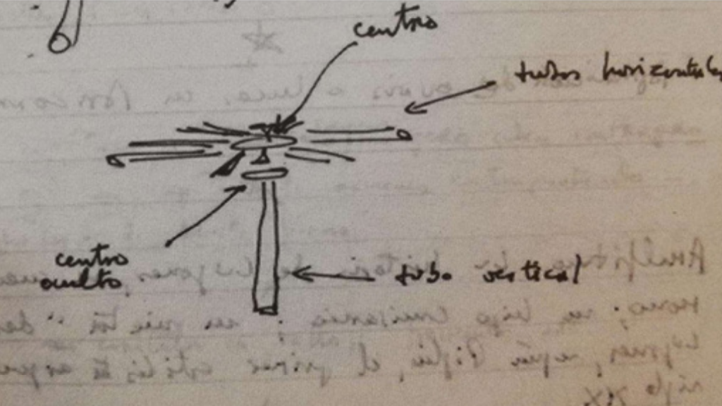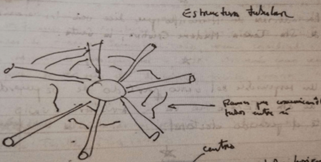 Todas las partes son sostenidas por la existencia del escritor alemán, pero además, atendiendo a los apuntes de Bolaño, se reconocen sutiles conexiones entre los diferentes tubos horizontales. En la siguiente imagen, en vista cenital, se aprecian unas ondas, ramas o nerviaciones que interconectan las partes entre sí. Esas ramas son el testimonio del juego de espejos en el que Bolaño entra para materializar la interconexión que cohesiona la novela. Estas ramas se reflejan, brotan unas de las otras, rebotan y se confabulan entre sí para rodear toda la estructura como un haz de luz que la hace destacar.