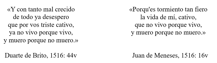 Por si fuera poco, estas concomitancias con los versos teresianos dentro de la poesía cuatrocentista superan con mucho las fronteras de la lengua castellana. En el propio Cancioneiro Geral que acabamos de mencionar encontramos versos en portugués que siguen esta misma trayectoria: «Com pena de mil tormentos / vevirei vida morrendo» (Duarte de Brito). Lo mismo sucede con el catalán (cuya literatura vivía un notable auge en los albores del siglo XV, con figuras como Juan March o Martorell), como prueban los ejemplos encontrados en el Cancionero Vega Aguillón: «yeu muyr e visch mil vetz en un momen: / muyr com no us dich mon amoros turmen, / visch com remir vostre joyos semblan». Y, por último, cabe mencionar casos similares en la poesía italiana medieval. Por ejemplo, en los sonetos de Petrarca es posible atisbar esta bimembración vida-muerte en clave amorosa, en versos que habitualmente se dirigen al mismo Dios de Amor: «E non m’uccide Amor, e non mi sferra; / né mi vuol vivo, né mi trahe d’impaccio. […] Egualmente mi spiace morte e vita. / In questo stato son, Donna, per Voi».
