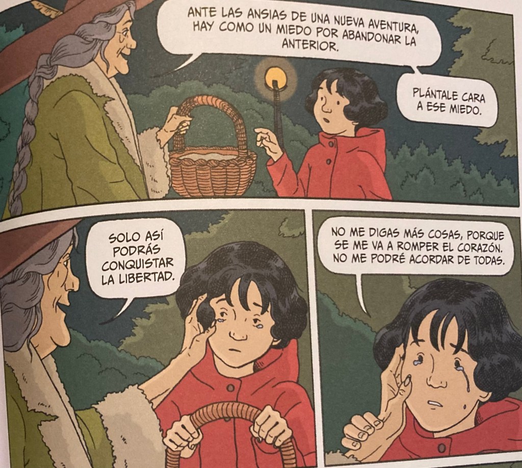La estructura de la historia se encuentra delimitada por la del cuento de Perrault, pero es precisamente este límite el que permite que la historia cambie en direcciones inesperadas. Encontramos una cesta, un viaje a casa de la abuela y la aparición de un lobo que llega antes que ella. Martín Gaite jugó con los nombres y los significados de las palabras, casi como si se trataran de sus propias farfanías. El trabajo impecable de González Vilar y Bonastre hace posible que el texto muestre el espíritu de la novela de 1990, a pesar de ser complicada la adaptación gráfica de un texto tan rico como el de la autora conmemorada. Con solo algunas pinceladas los personajes quedan retratados. De un ritmo de lectura fácil y asequible, mezcla diálogos profundos con intercambios de ideas sencillos. El texto y la imagen quedan muy bien integrados, complementándose en una simbiosis equilibrada.