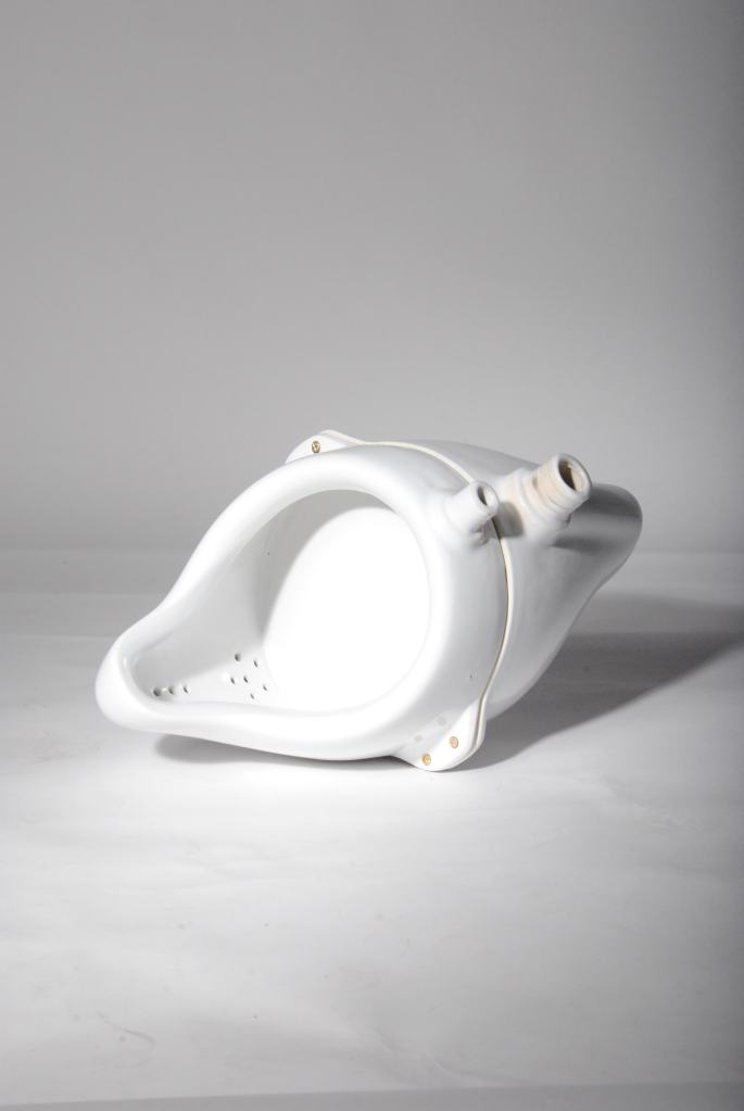 R: Intento que todo el libro sea una obra íntegra. Soy escultor, fabrico artefactos que trascienden en su forma, y en este caso, también con el contenido del texto. Me involucro en el objeto libro y decido: la calidad del papel, la tipografía, la proporción del objeto o su manufactura, y por supuesto, la portada. La obra Doble ida y vuelta, son dos urinarios ensamblados y es un homenaje al primer readymade de Duchamp de 1914. Creo que es la primera obra americana que influyó decisivamente en el arte contemporáneo. Esta escultura alude a los recorridos de ida y vuelta, al agua y a los caminos compartidos en la intimidad. Las hojas de la publicación de Vltramarino se mostraron en la exposición de Santander acompañadas de la escultura de la portada del libro. Los espectadores pudieron leer los poemas entorno a la escultura.